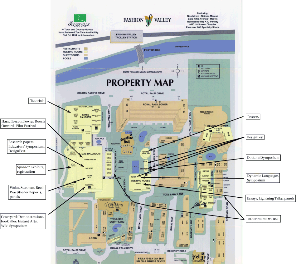 Where things are held can be a little confusing this year. Below is a map of where some of the things are being held. But beware that this is not a complete map. For example, only some tutorials are being held in the Pacific Salon rooms—others are in the Royal Palm Salons (just to the right of the Atlas Ballroom) and other places. Workshops are not listed since they take place all over, including in the rooms on the far right middle of the map like Clarendon, Brittany, Fairfield, and Eaton.
