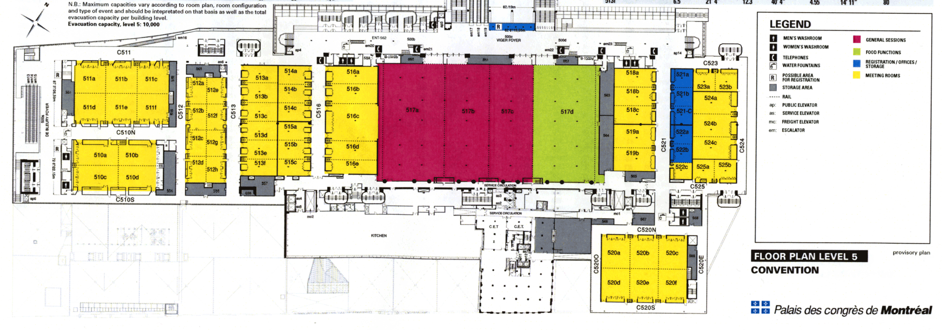 Here are the rooms we have; note that room sizes are the largest seating capacity they can be (theater). When this diagram was made we had every room at one time or another during OOPSLA, but we traded 511 for having 516 the whole time instead of just Sunday and Monday. So, Room 511 is not ours at all: