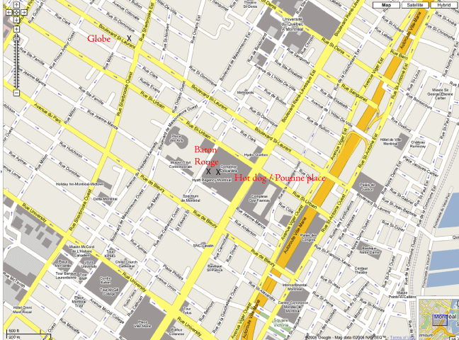 When you arrive at the conference hotel (the Hyatt) late-ish, this is your most convenient and possibly only choice. It’s down the elevator from the Hyatt Lobby, in the underground shopping complex (on level P2, I think), and also there’s an entrance on Ste Catherine. It has mostly burgers, chicken, steaks, and ribs, kind of in a New Orleans style, but keep in mind it’s a chain. You will eat a lot better here than in a fast-food place, but don’t expect high-end cuisine. I ate dinner there the first night I arrived and also had a lunch there. Cheap, too. [rpg 2007]
